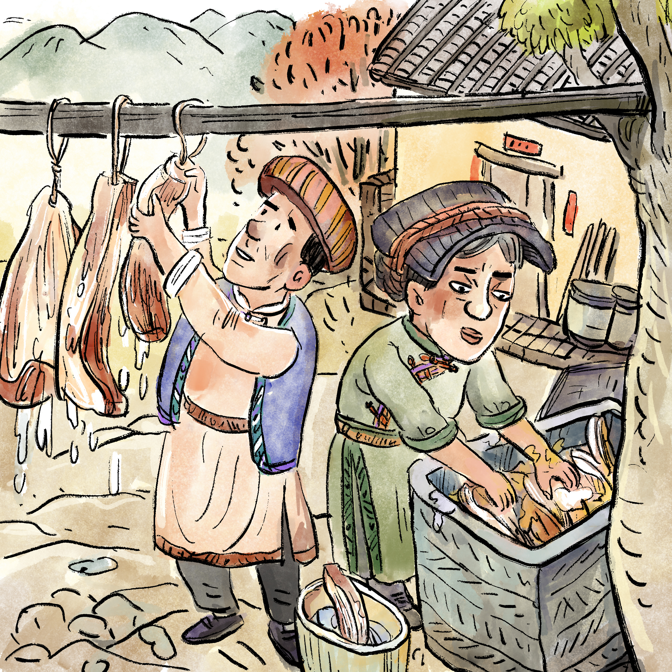 其次是在腌制和烟熏的过程中也有独到之处。鲜肉敷盐时,盐要炒得烫手,肉块厚的要多抹,肉块薄的要少抹,多少得凭经验,否则不是太咸就是太淡。太咸了口味差,太淡了也不好吃,而且不易保存。