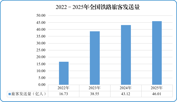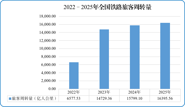 客运方面。2025年,全国铁路累计完成旅客发送量46.01亿人,同比增长6.7%;完成旅客周转量16395.56亿人公里,同比增长3.8%。12月份,完成旅客发送量3.23亿人,同比增长8.5%;完成旅客周转量1015.59亿人公里,同比增长6.0%。