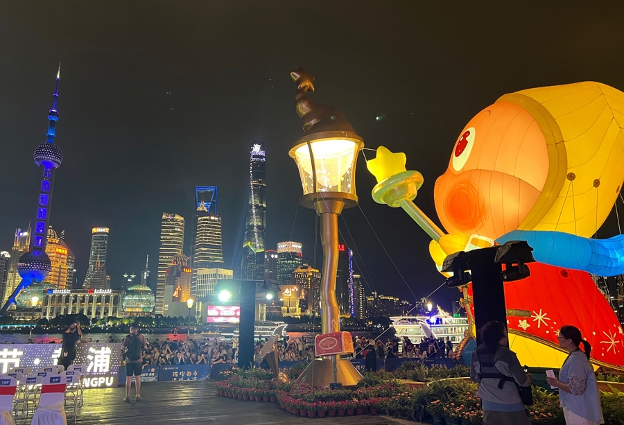 “上海国际光影节•黄浦”主题活动近日在外滩开启,巨大的“星星人”点亮了黄浦江畔 新民晚报记者 周馨 摄影