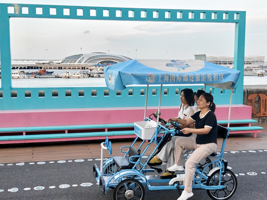 天气逐渐凉爽,市民在宝山滨江灯塔营地骑车休闲 新民晚报记者 刘歆 摄影
