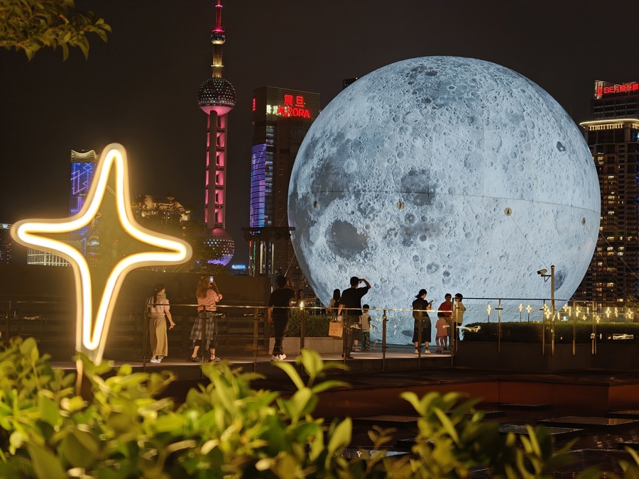 上周末,以“光影超感大豫园”为主题的外滩艺术季开启。BFC外滩金融中心南区露台上专业在线配资炒股查询,一轮直径10米的“超级月亮”升空,与北区广场18米高的“地球”遥相对望 新民晚报记者 刘歆 摄影